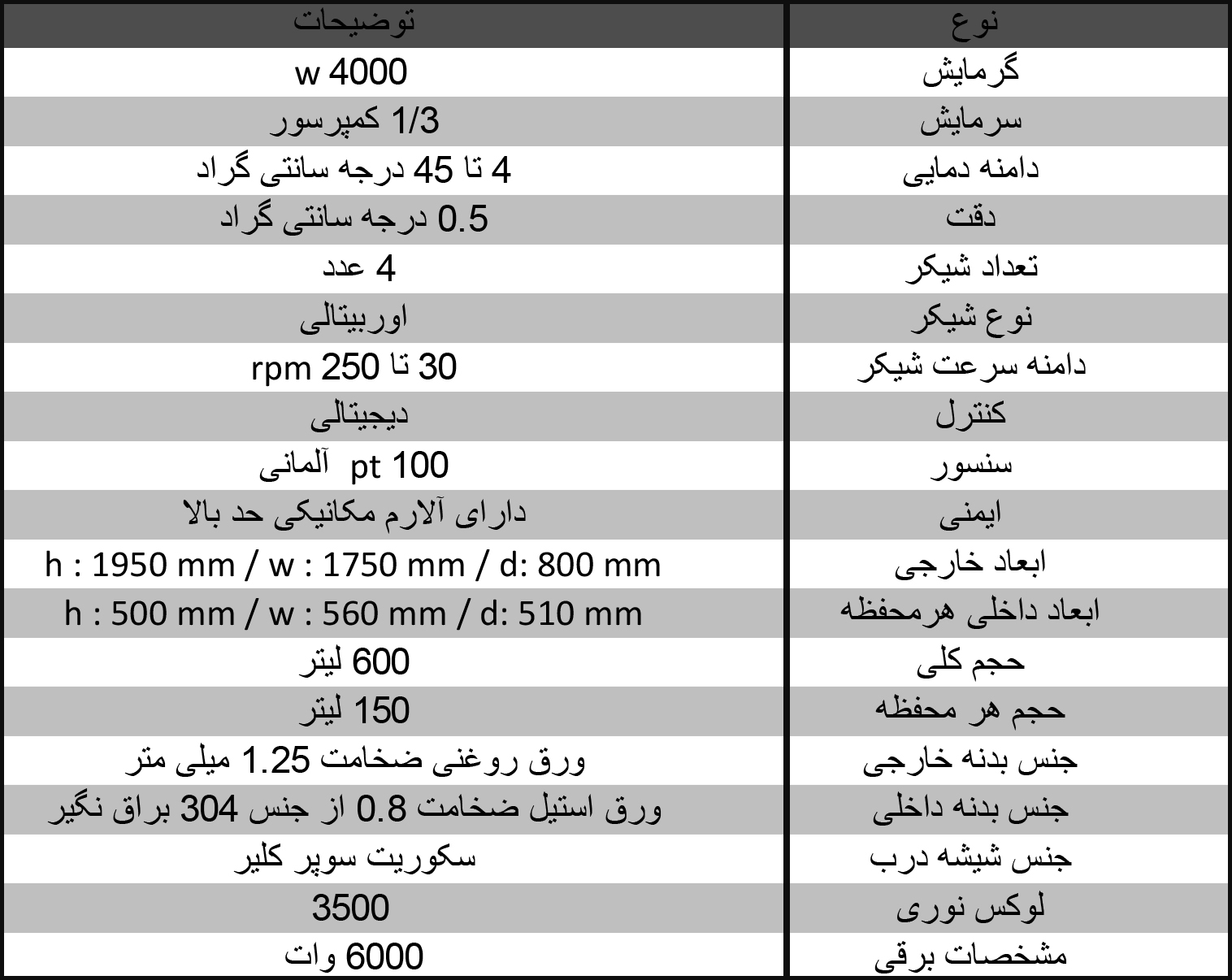 این دستگاه در حجم 600 لیتر ساخته شده است. اما قابل ذکر است که ما میتوانیم دستگاه را در حجم های دیگر و حجم های سفارشی نیز بسازیم. هر محفظه یک دستگاه شیکر انکوباتور بخچالدار 150 لیتر اختصاصی میباشد. محدوده دمایی و محدوده سرعت شیکر اختصاصی خود را دارد. کاربر به راحتی میتواند تنظیمات مورد نیاز برای هر محفظه را بدون تغییرات در تنظیمات محفظه های دیگر اعمال کند. سهولت کار با این دستگاه یکی از ویژگی های اصلی این دستگاه نوین است.